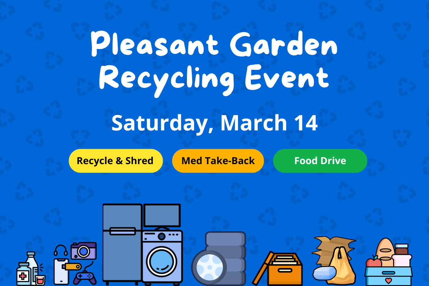 Guilford County, the Town of Pleasant Garden, and community partners invite all county residents to participate in the Pleasant Garden Community Recycling Event on Saturday, March 14, from 8 a.m. to noon, at the Pleasant Garden Community Center, 5024 Alliance Church Rd.
